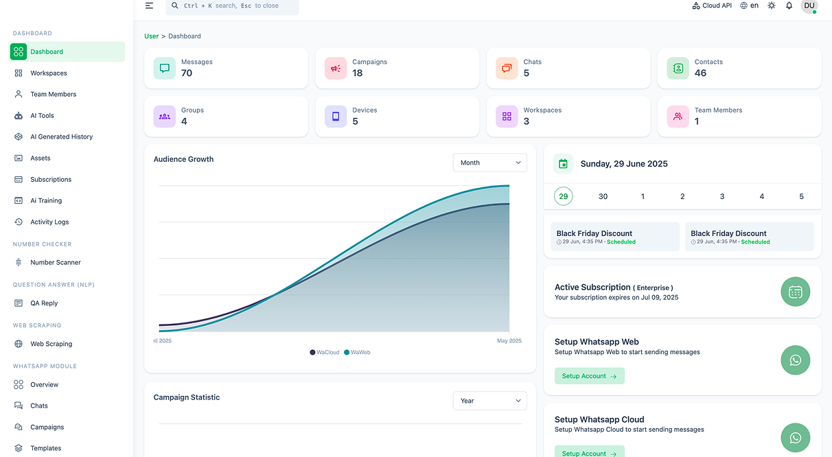 From promotional broadcasts to personalized engagement messages — you can run bulk, scheduled, and AI-driven campaigns easily.